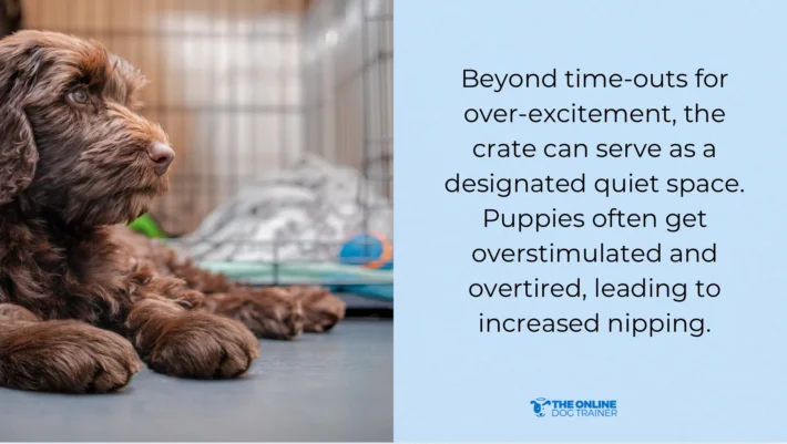 Your puppy can also nibble and bite due to excitement. If your puppy's extreme energy is getting in the way of you training them not to bite, you can place them in their crates to help them relax. It could be in the laundry room, or your dog's sleeping area. If you have a designated confinement area for your dog to destress and relax, you can also use that.