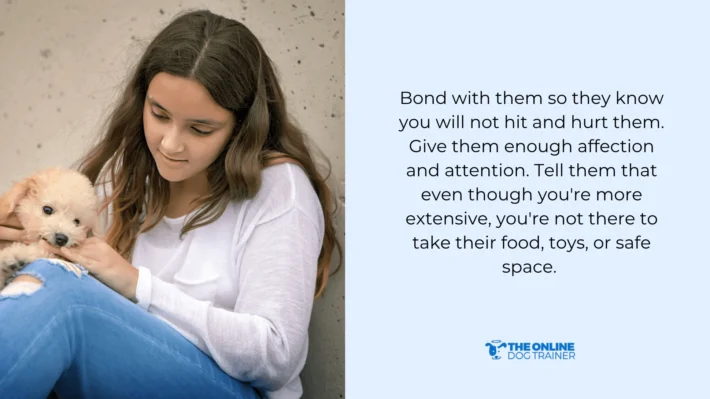Bond with them so they know you will not hit and hurt them. Give them enough affection and attention. Tell them that even though you're close, you're not there to take their food, their good chew toys, or safe space.