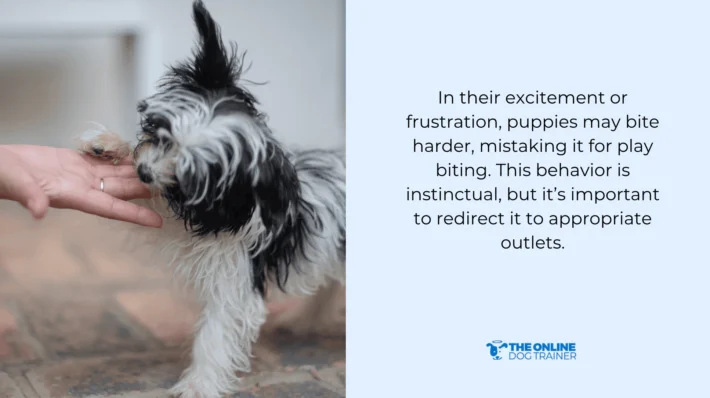 In their excitement or frustration, puppies may bite harder with their sharp teeth, mistaking it for play biting. This behavior is instinctual, but it's important to redirect it to appropriate outlets.