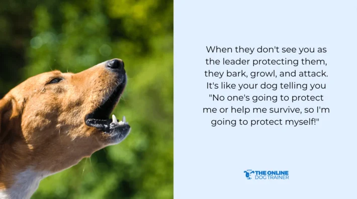 When they don't see you as the leader protecting them, they bark, growl, and attack. It's like your dog telling you “No one's going to protect me or help me survive, so I'm going to protect myself!”