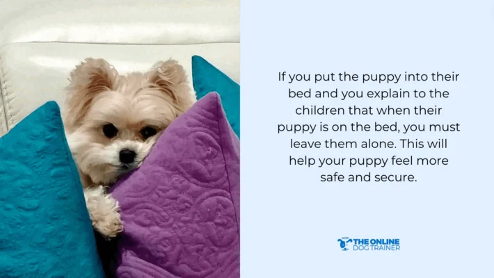 If you put the puppy into their bed and you explain to the children that when their puppy is on the bed, you must leave them alone. This will help your puppy feel more safe and secure.