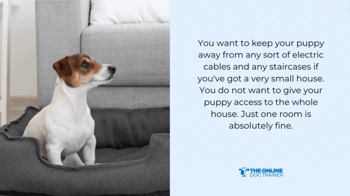 You want to keep your puppy away from any sort of electric cables and any staircases if you've got a very small house. You do not want to give your puppy access to the whole house. Just one room is absolutely fine.