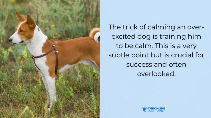 The trick to calming an overexcited dog is training him to be calm. This is a very subtle point, but it is crucial for success and often overlooked.