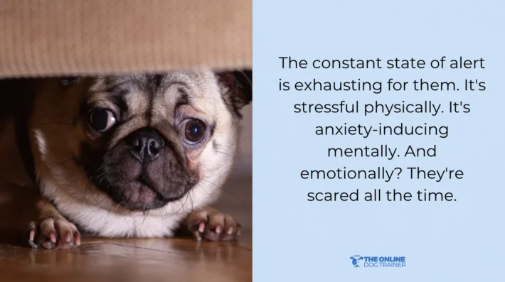 Your dog is constantly anxious. They can't calm down because they're always on guard and alert. They’re always scanning the surroundings for threats. Their mind never gets a break.